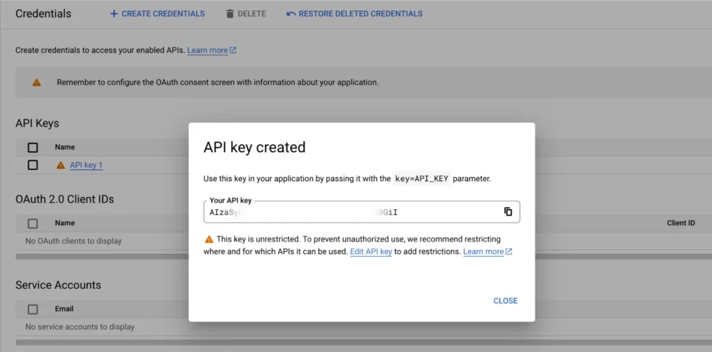 Your API key is now created. You can close the pop-up window for now.