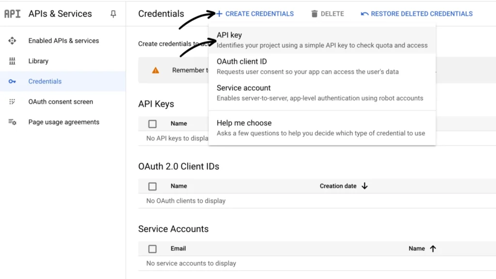 Step 6: Create the Maps API key. On the API Credentials page, click + CREATE CREDENTIALS > API key.