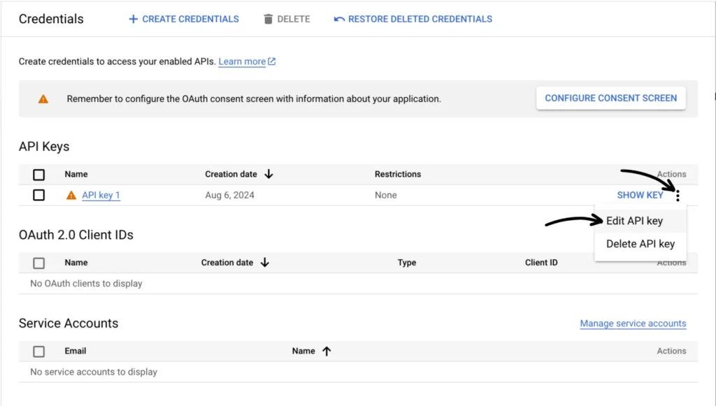 From the API Credentials section, click the three-dot menu of your newly created API key and then select Edit API key.