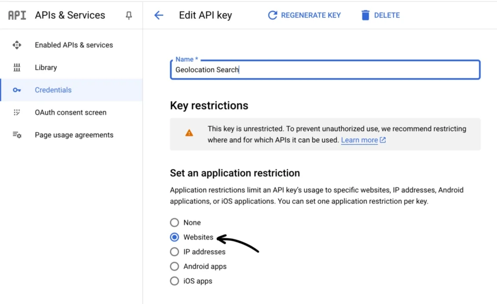 Once all required APIs are enabled, return to your API Credentials page and restrict your API key.