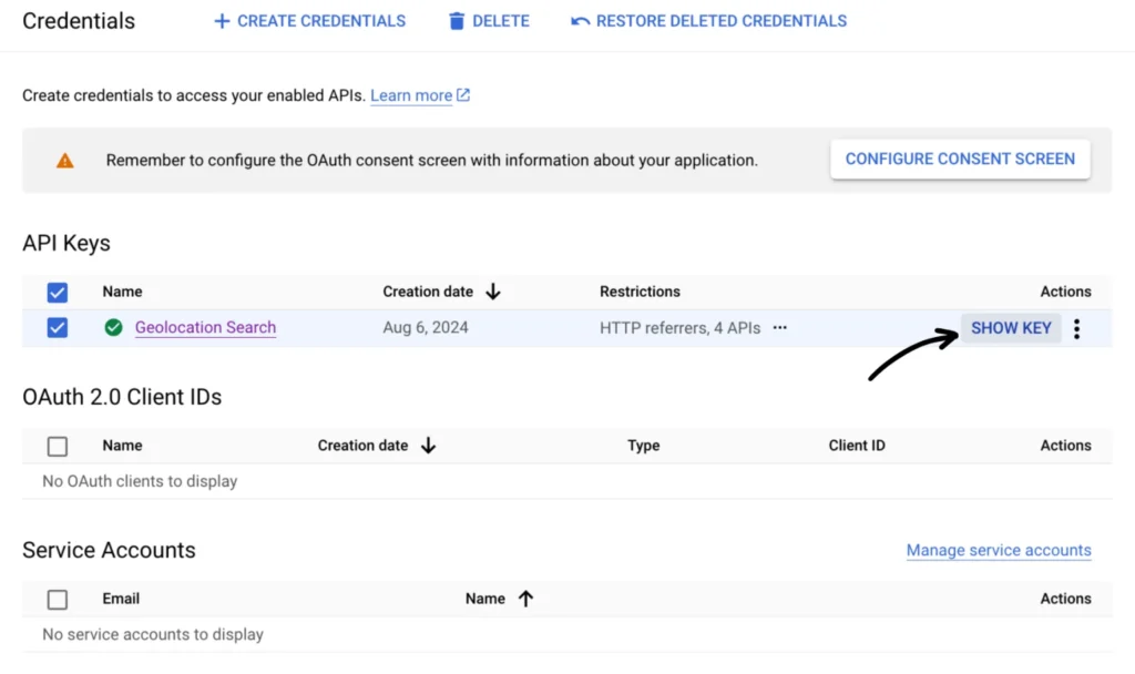 Go to the API Credentials page and click SHOW KEY under API Keys to copy your API key.