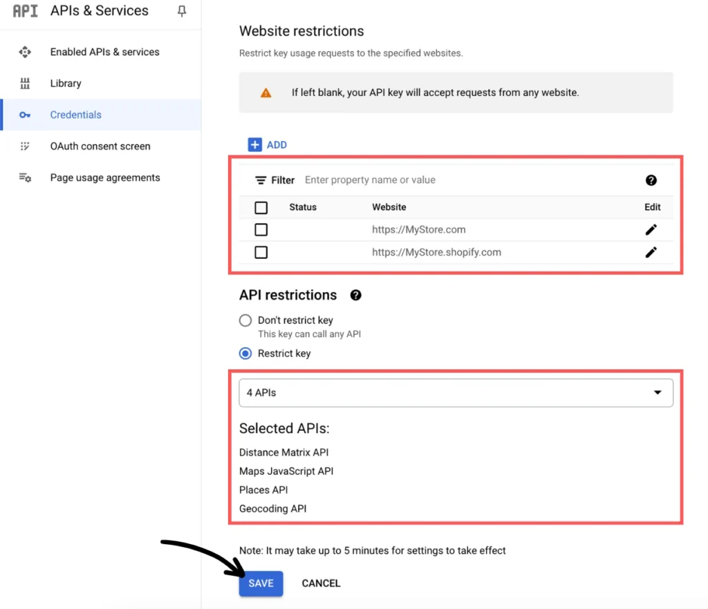 Under “Website restrictions”, click the + Add button to enter your website address (for example “https://MyStore.com”) and also add your myshopify.com address. Under “API restrictions”, select Restrict key and choose the three APIs enabled earlier.