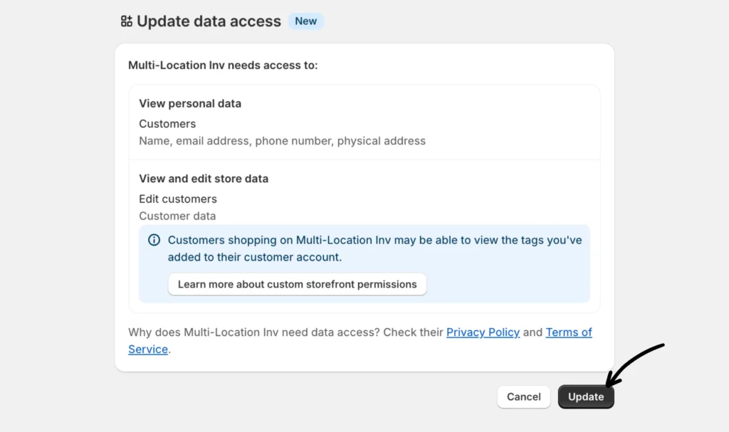 Step 4: Next, click Update to confirm the data access permission.