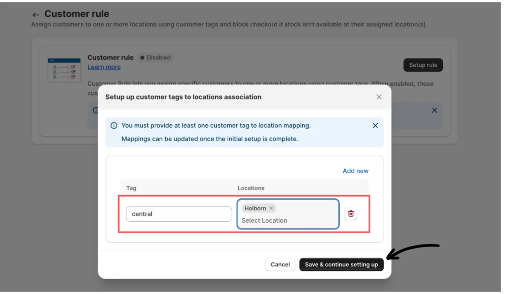 Step 5: You’ll be routed back to the Customer rule page. Click Setup rule again to continue with the setup. This will open the pop-up window where you can configure your customer tag-to-location mappings.