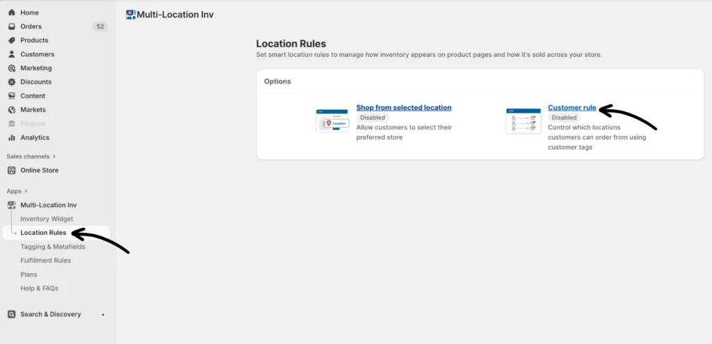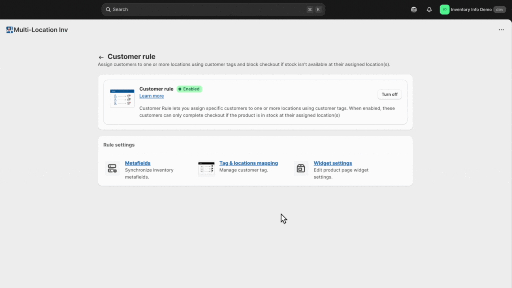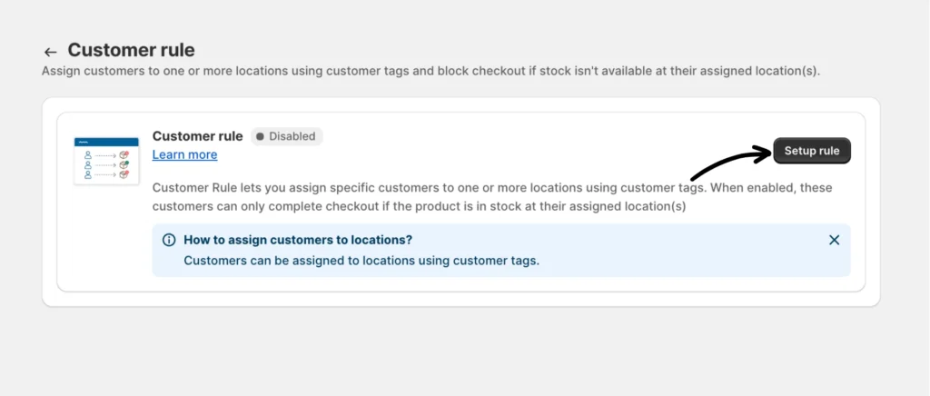 Customer Rules let you assign specific customers to one or more locations using customer tags. When enabled, these customers can only complete checkout if the product is in stock at their assigned location(s).