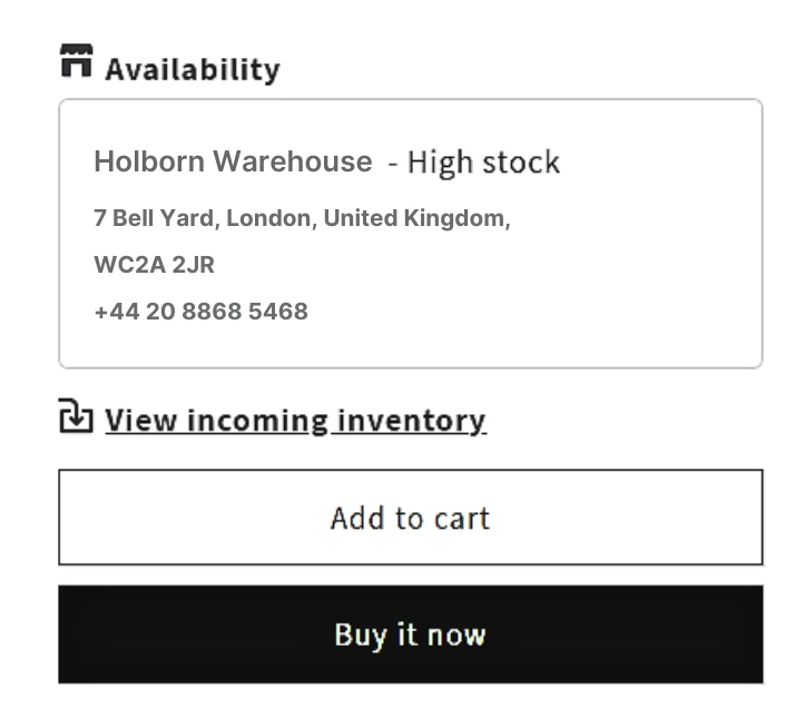 • Sold out text – Text shown when Add to Cart is disabled due to rules or stock. Example: Awaiting restock.