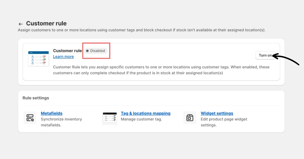 Step 4: Click Location Rules > Customer rule and ensure it is enabled. If not, click the Turn on button to enable it.
