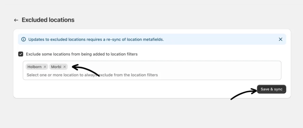 From here, you can manage which locations are excluded from Shopify filters. Select one or more locations, then click Save & sync.