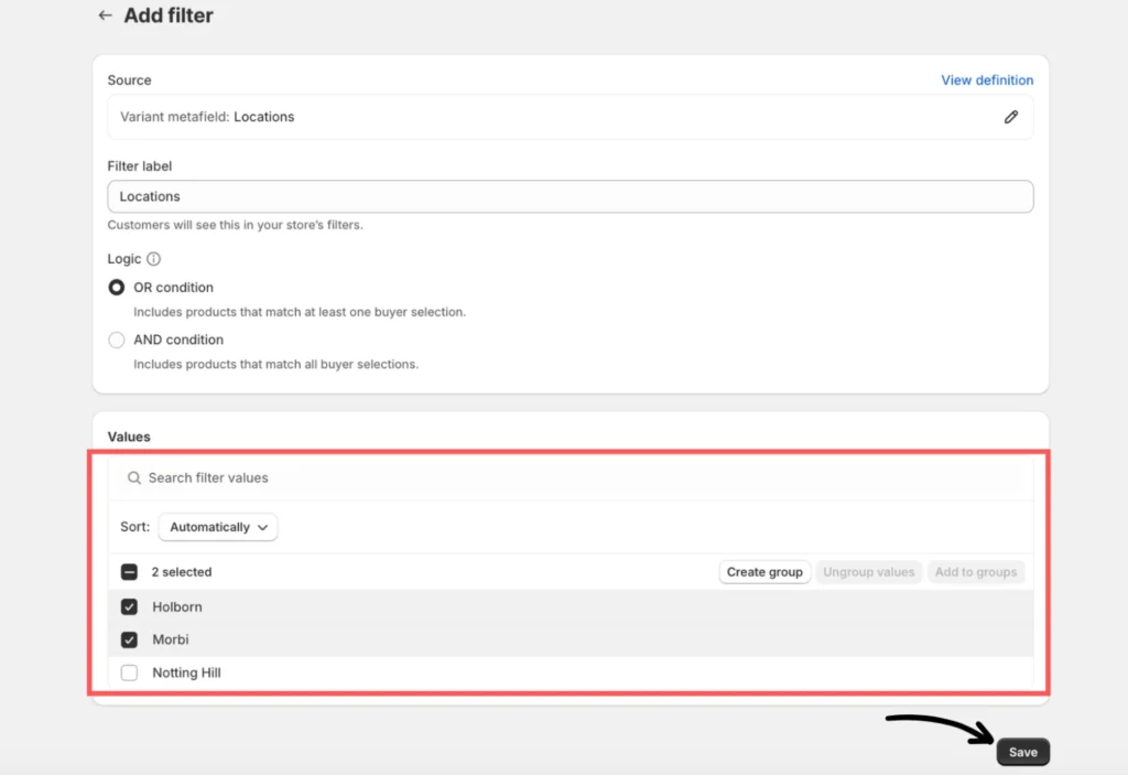 Click + Select source and choose Locations (Type: Variant metafield) from the list.