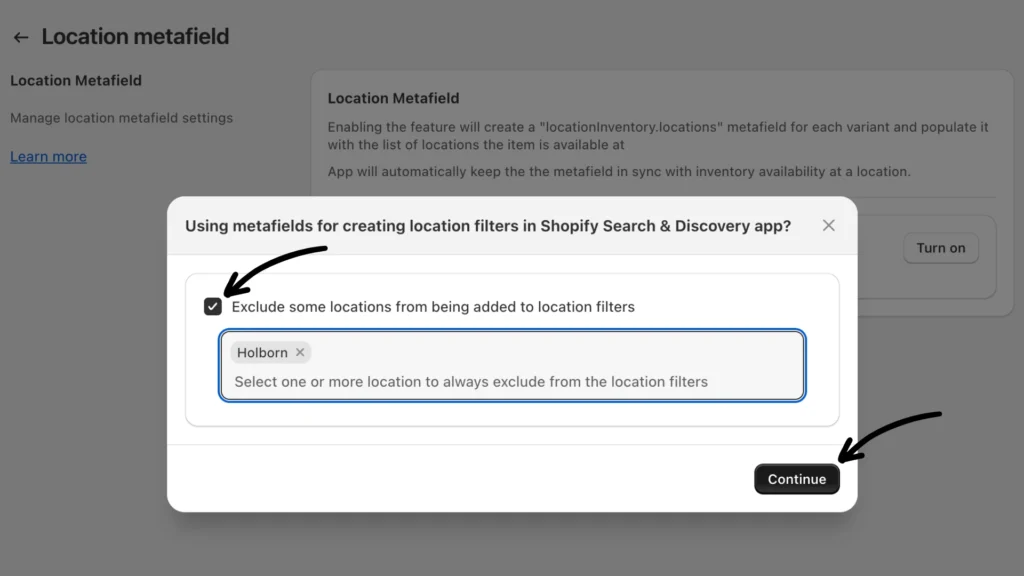 When you turn this feature on, a prompt will appear asking whether to exclude certain locations from the Shopify Search & Discovery filters. Check the box to select one or more locations, then click Continue.