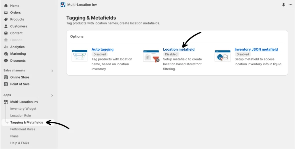 In the Multi-location Inventory Info app, navigate to Tagging & Metafields > Location Metafield.