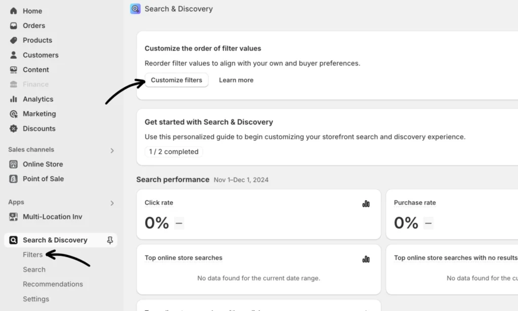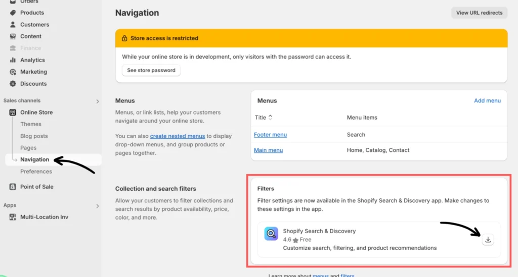 Go to the Online Store and select Navigation. Scroll to “Collection and Search Filters” and click the button to install the Shopify Search & Discovery app.
