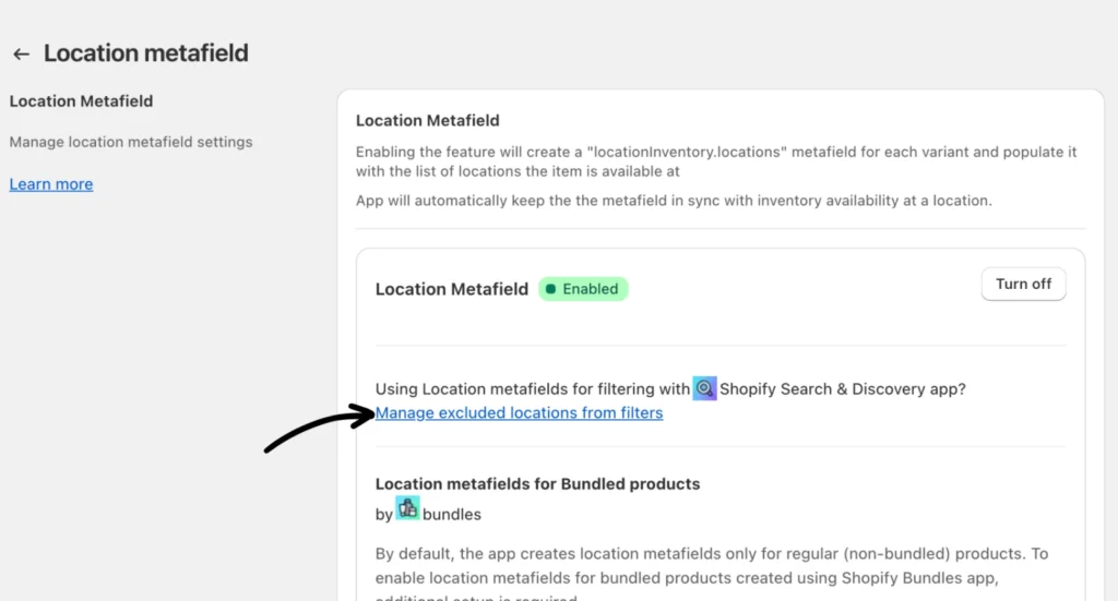 Suppose you already have the Location Metafield configured before. In that case, you can simply click on Manage excluded locations from filters to get to the excluded locations list.