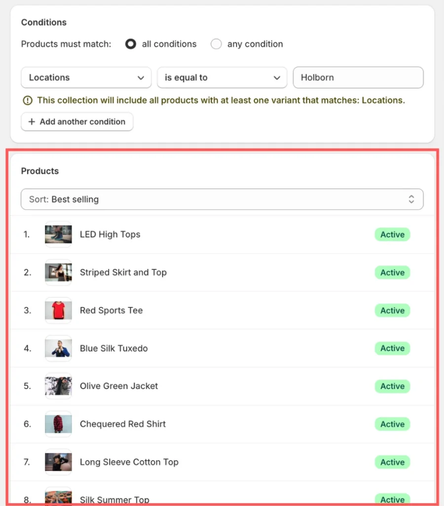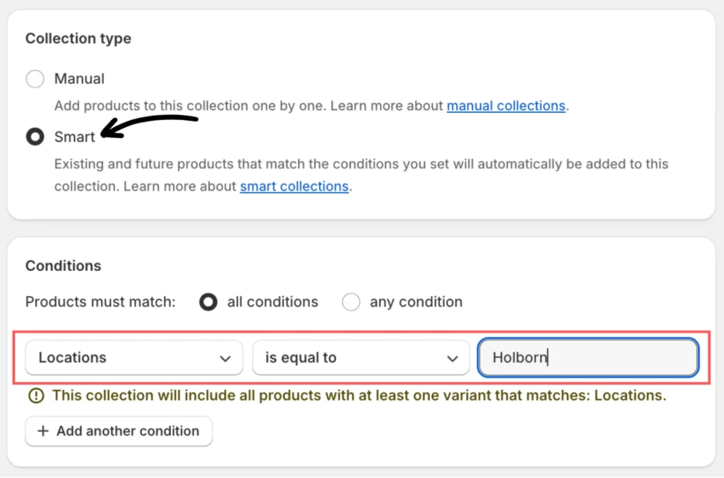 Next, select Smart as your Collection type. For the conditions, specify Locations > is equal to > enter the location name where these products are available (e.g., Holborn).