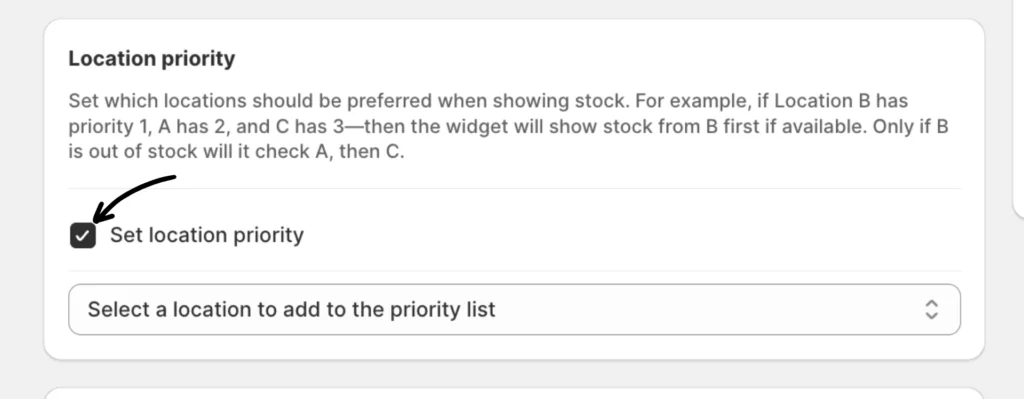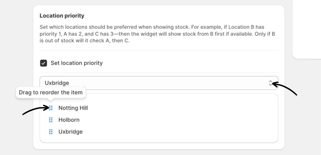 Use the Location Priority setting in the Multi-location Inventory Info app to control the priority order in which locations show stock availability. This helps ensure that inventory from your preferred locations appears first in the widget.